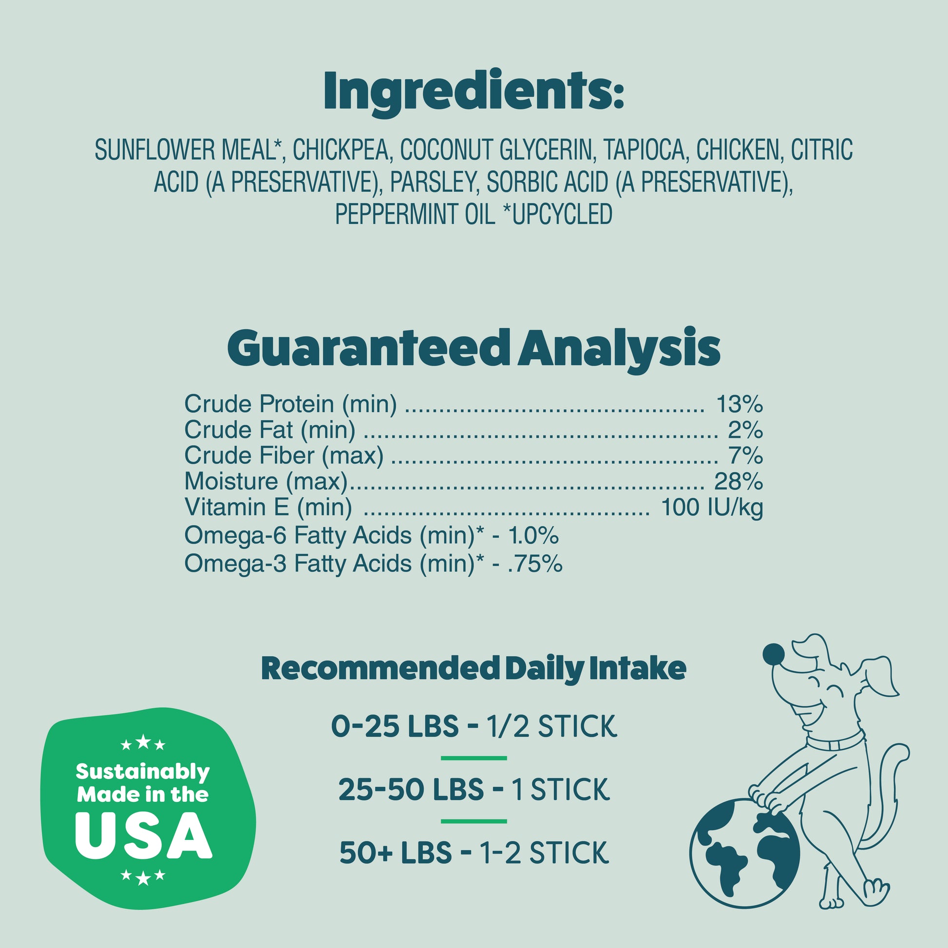 Sunflower meal*, chickpea, coconut glycerin, tapioca, chicken, citric acid (a preservative), parsley, sorbic acid (a preservative), peppermint oil