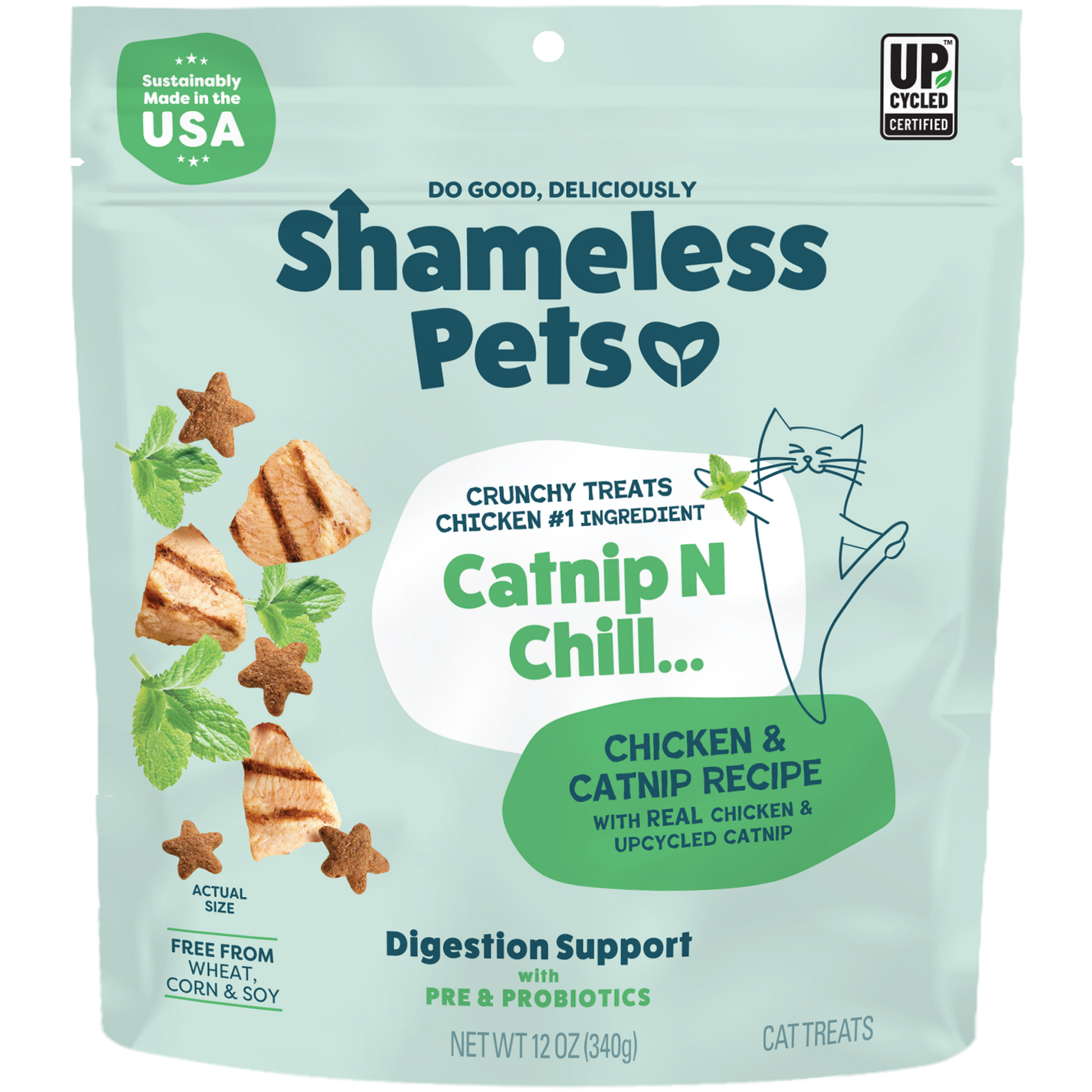 You know when you just need your cats to chiiiiiiiill out? Like you LOVE them, but sometimes they just need to take a chill pill... or a chill treat. Well, Shameless Pets has the purrfect tasty solution for you. Introducing Catnip N Chill Chicken Crunchy Cat Treats. Made with real, upcycled catnip for that nice long nap on the couch. Pair that with pre & probiotics AND chicken as the #1 ingredient, this treat will become essential to your cat's self-care routine.
