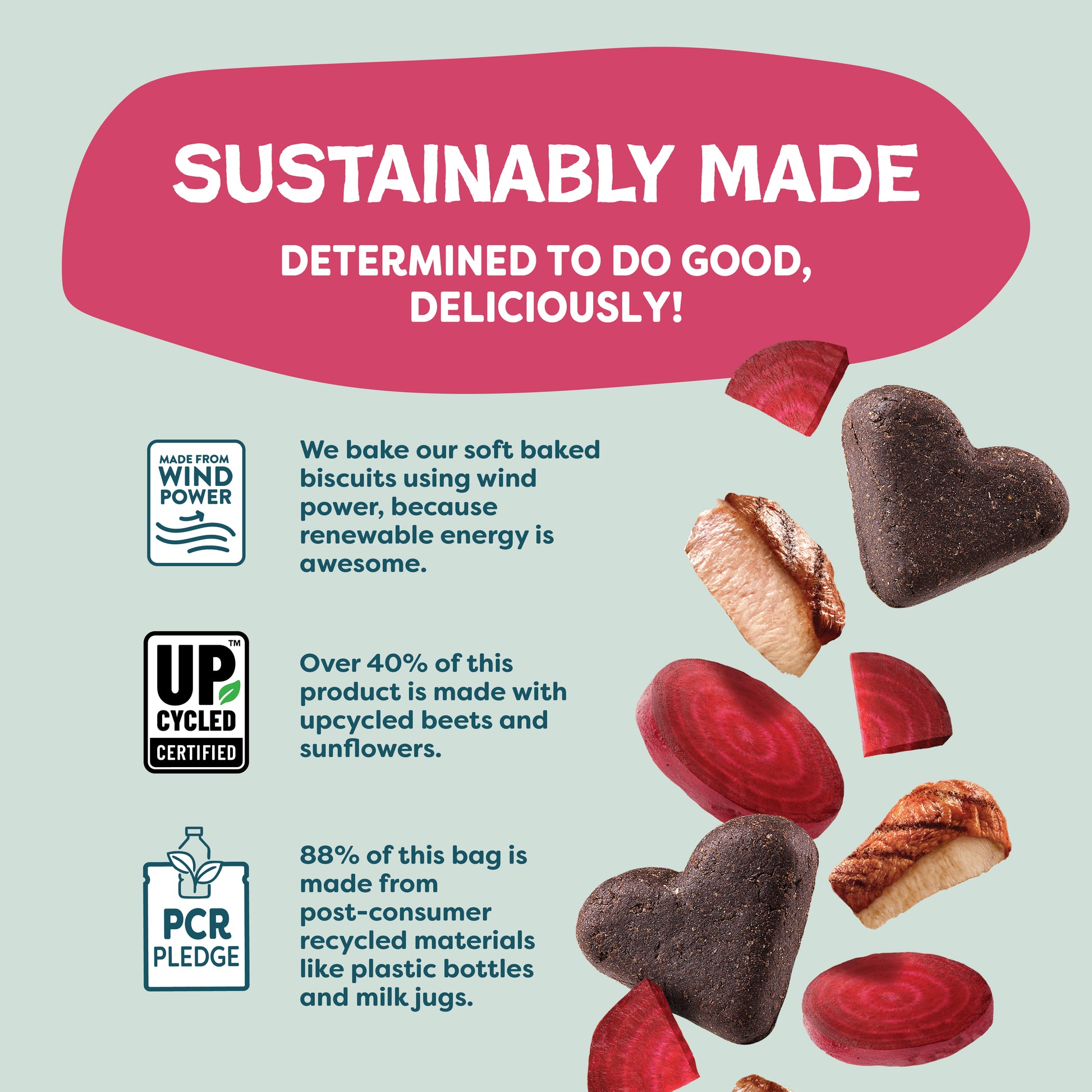 Ingredients: Sunflower meal*, potato, duck, beet*, vegetable glycerin, flaxseed meal, cane molasses, sunflower oil, miscanthus grass, citric acid (a preservative), vinegar, mixed tocopherols (a preservative), rosemary extract