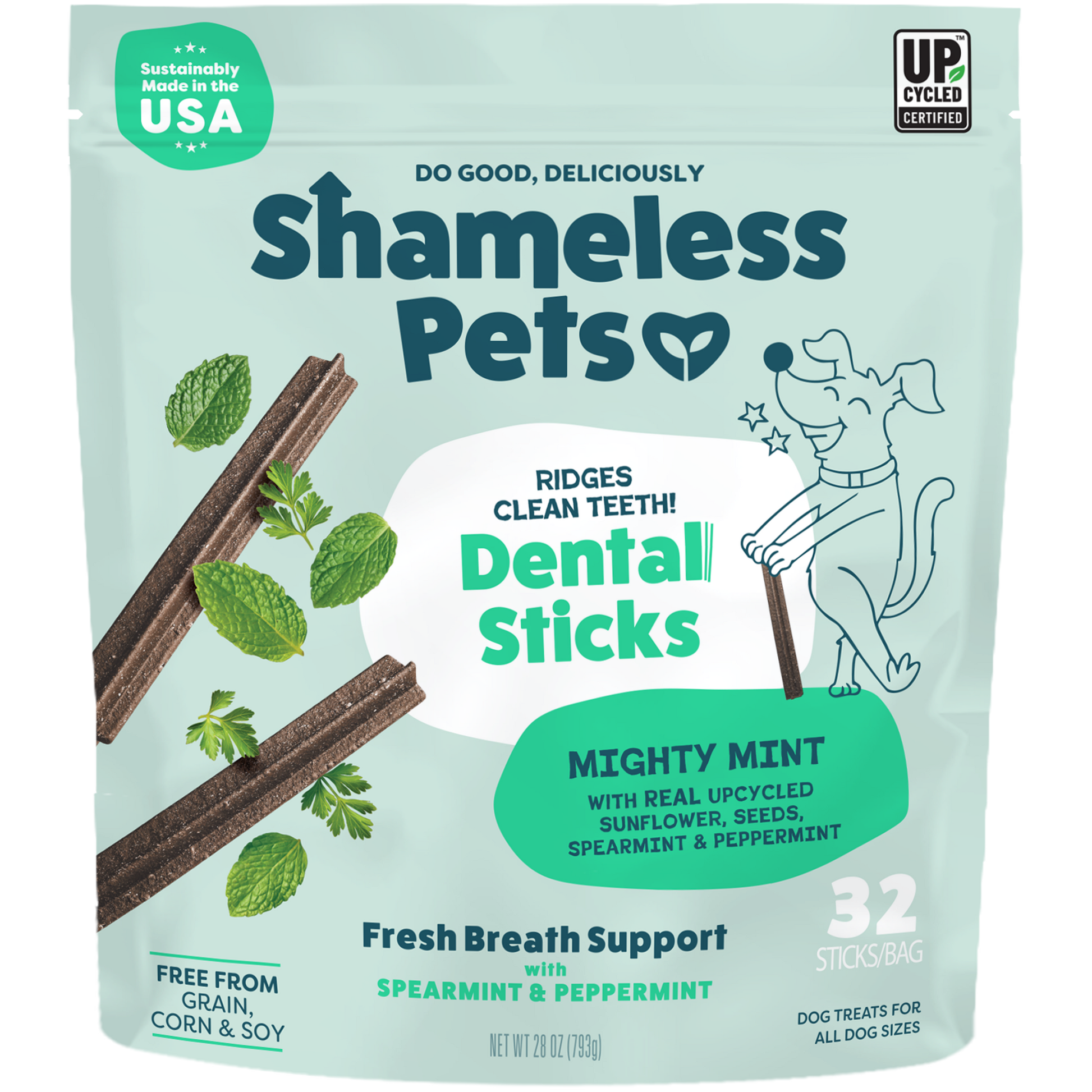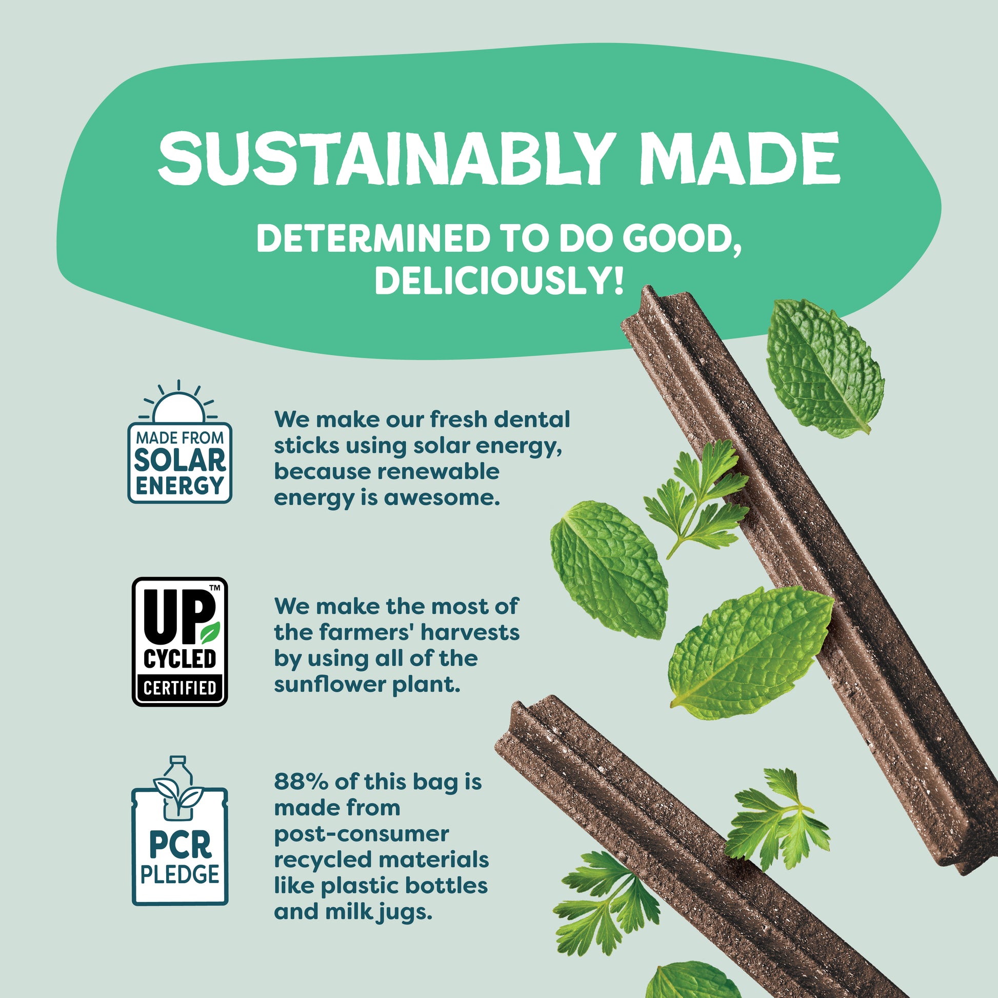 The mightiest, mintiest dental sticks in-town with real spearmint, peppermint, and parsley to keep those tongue kisses smelling good! Plus the deep ridges on these sticks help clean teeth down to the gums, to support plaque and tartar removal. Perfect for medium to large dogs. Large bag so you have plenty of breath freshening for the whole month.